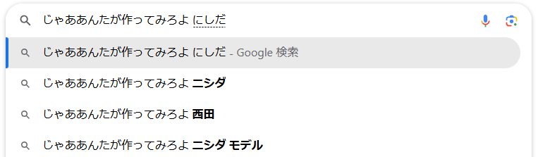 Googleの検索候補には「じゃああんたが作ってみろよ ニシダ」に関連するキーワードが多数出てきます。