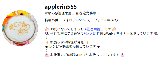 子育て中につき在宅で、レシピ作成やWEBデザイナーをされていると書かれています。