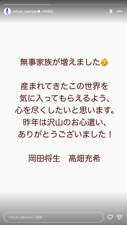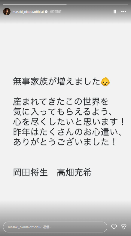 高畑充希さんと岡田将生さんが、連名でそれぞれのインスタのストーリーに家族が増えたことを報告しています。